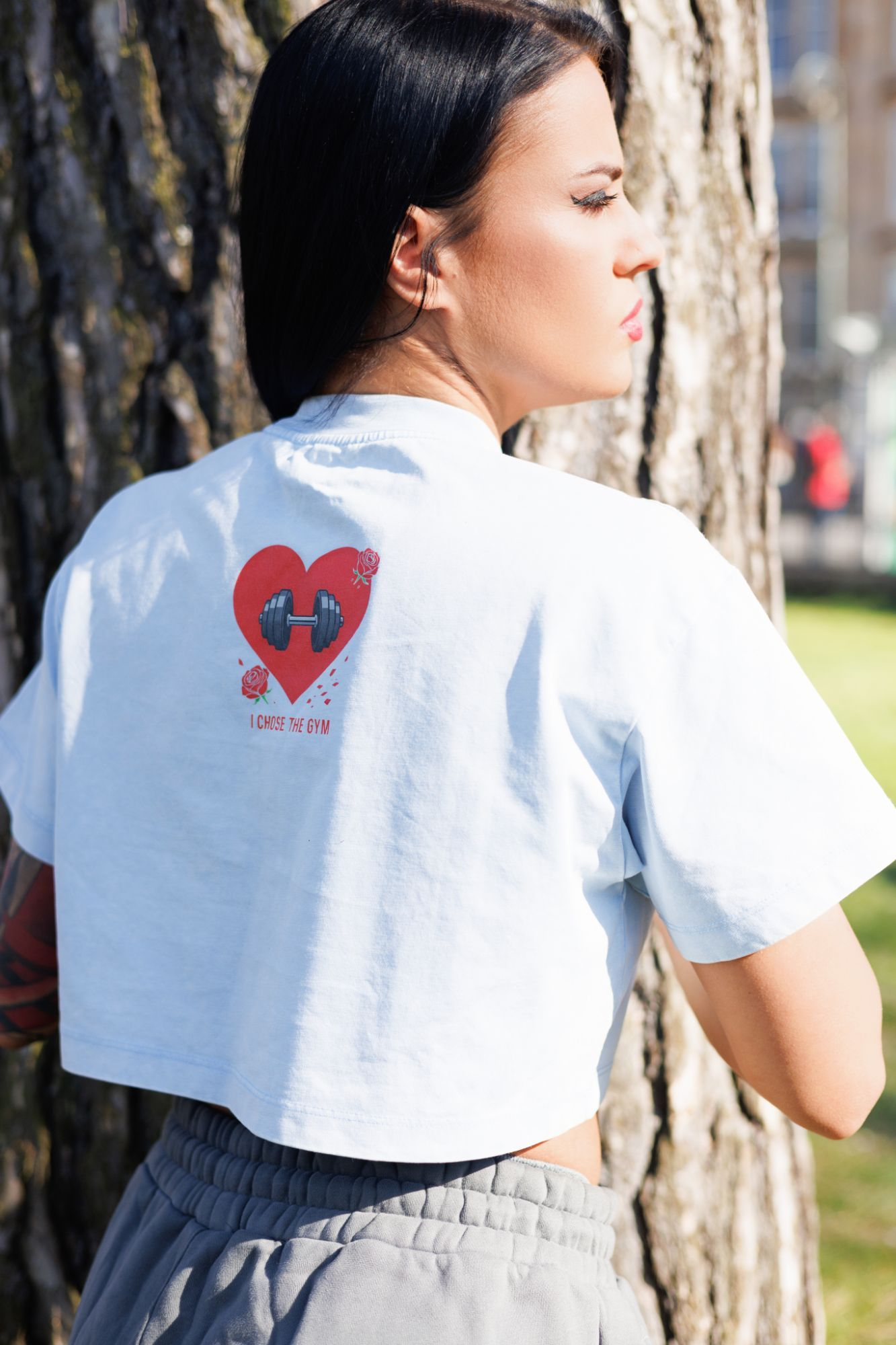 This isn’t about romance — it’s about respecting the grind. The “I Chose the Gym” crop tee is a bold statement of priorities: discipline over distractions, growth over comfort. With a vintage-washed sky blue and clean cropped fit, it’s built for those who stay committed to the lifestyle — no excuses, just work.