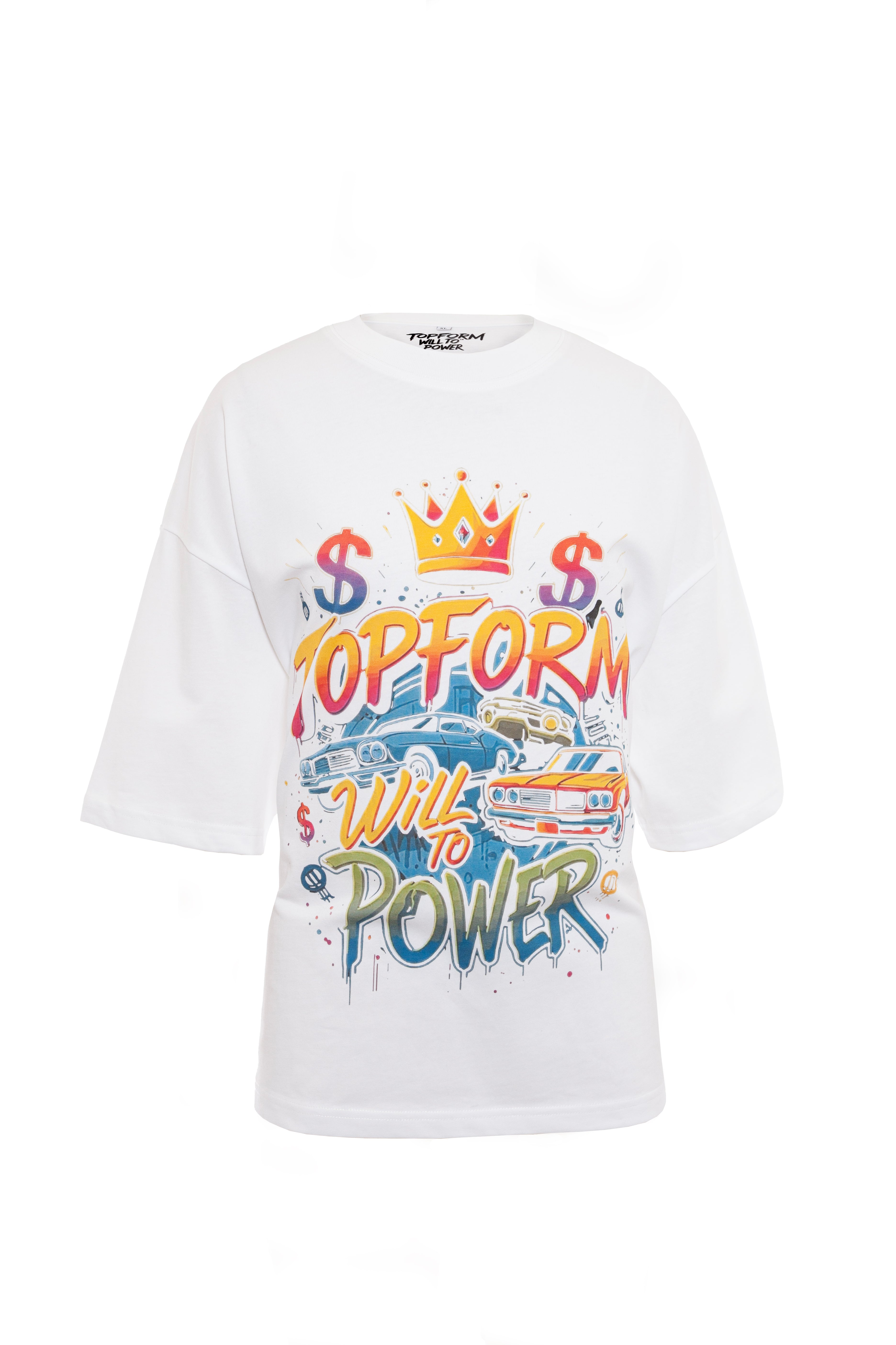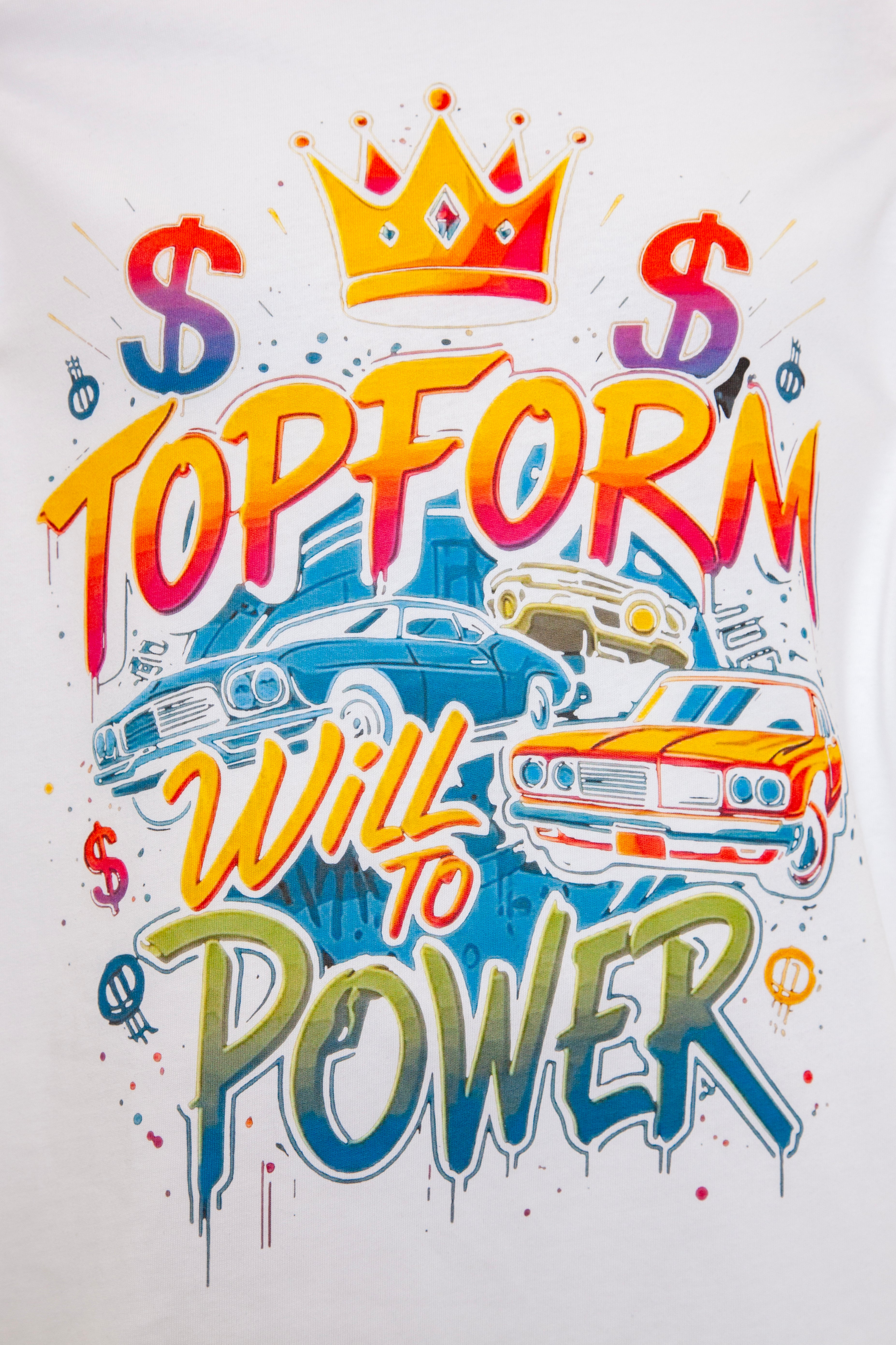 Step into the essence of strength and ambition with this statement piece from the Topform King Range. Crafted from premium 100% cotton, this white T-shirt features the bold "Will to Power" graphic, blending vibrant colors, a crown emblem, and empowering motifs that symbolize success and resilience.