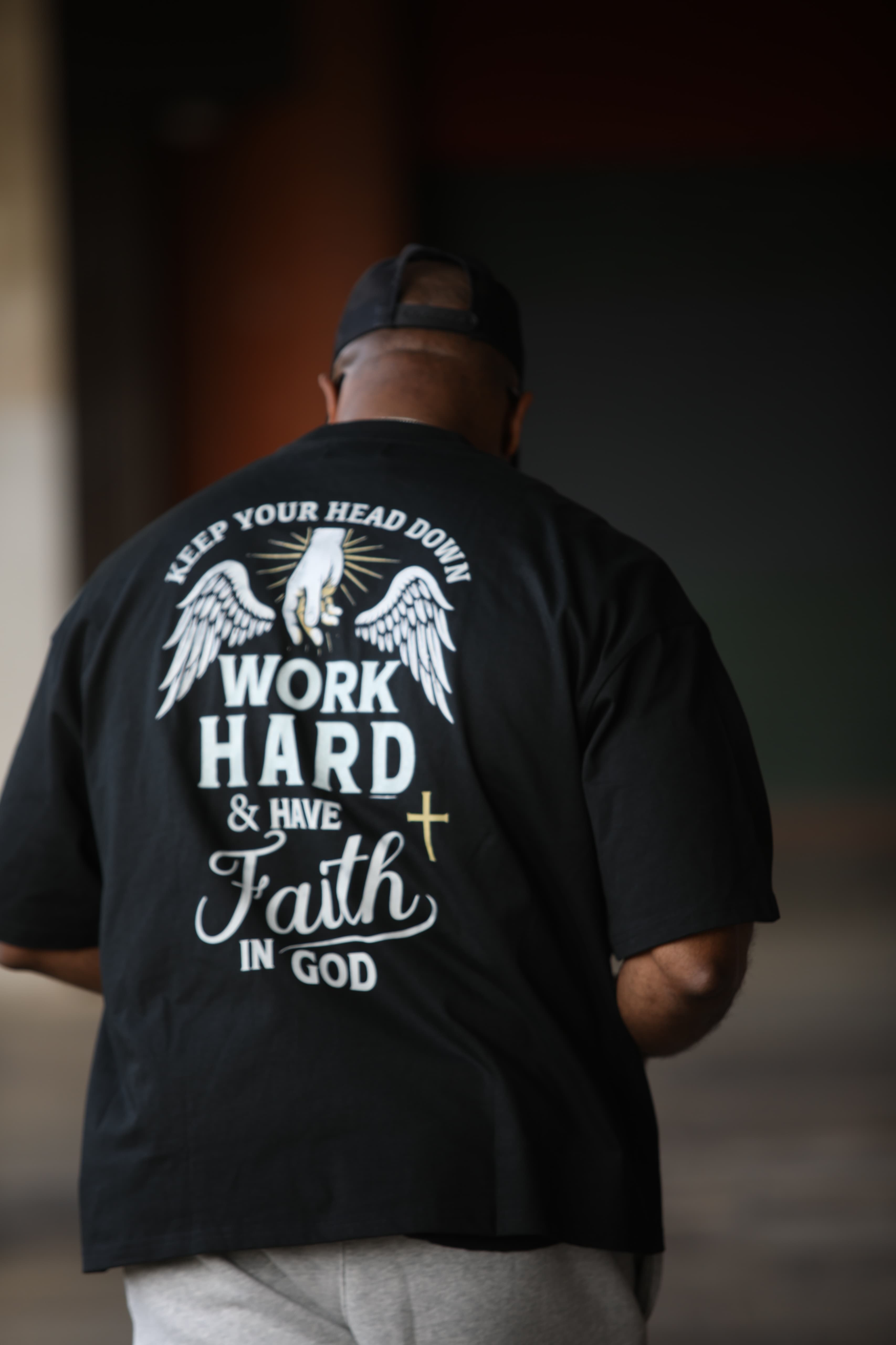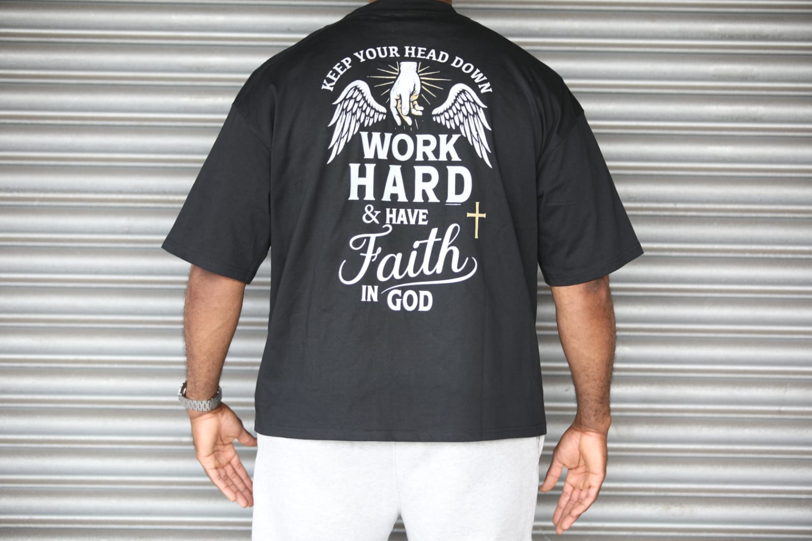 © 2025 Topform Wear. “Keep Your Head Down, Work Hard & Have Faith in God” design including angel wings, divine hand symbol, and gold cross is an original trademarked artwork of Topform Wear. All rights reserved.